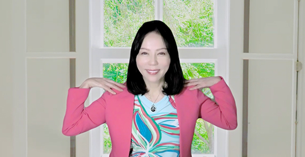 2)両手を組み、吸う息で腕を伸ばして、手のひらを天に向けて胸を開ける