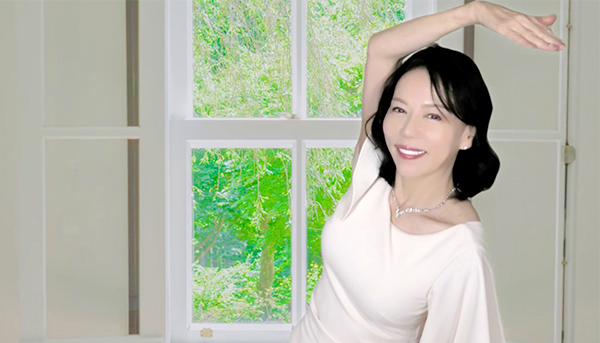 3)吐きながら、右手を座面に添え、上体をゆっくりと右側に倒す(側屈)。左手は、虹を描くように頭の先へと伸ばし、胸を開く