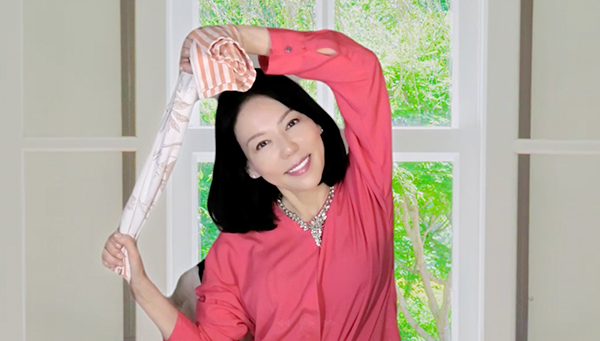 3)吸う:タオルを持った両腕を、ゆっくりと頭上へ引き上げ、吐きながら右側に体を倒す(4呼吸ほどキープ)