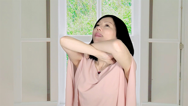 2)両腕を胸の前でクロスさせ、自分を抱きしめる。指先で反対側の肩甲骨を触るイメージ