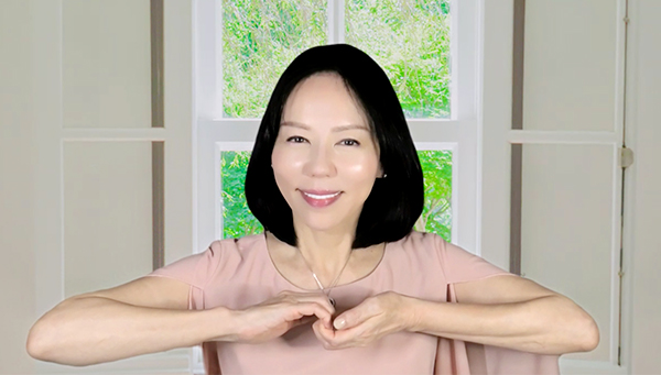 左手のひらを上に向け、胸の前に置く。右手のひらを下に向け、両手が心臓の高さでカチッとフックするように指を組み合わせる。