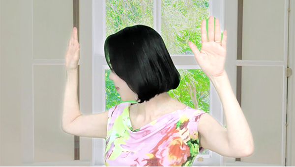 2)両腕を横に広げ、肘を90度に曲げる(手のひらは正面に向ける)